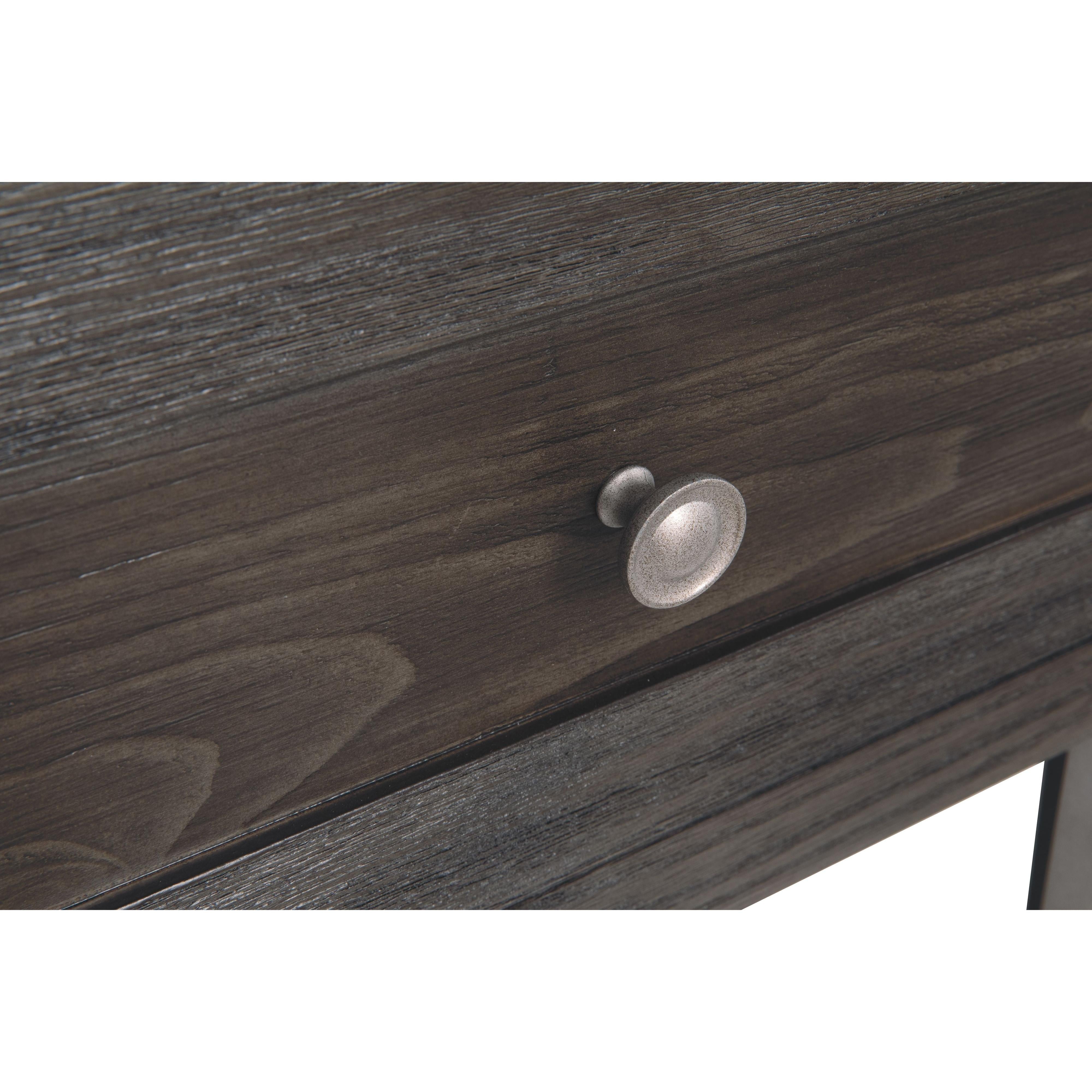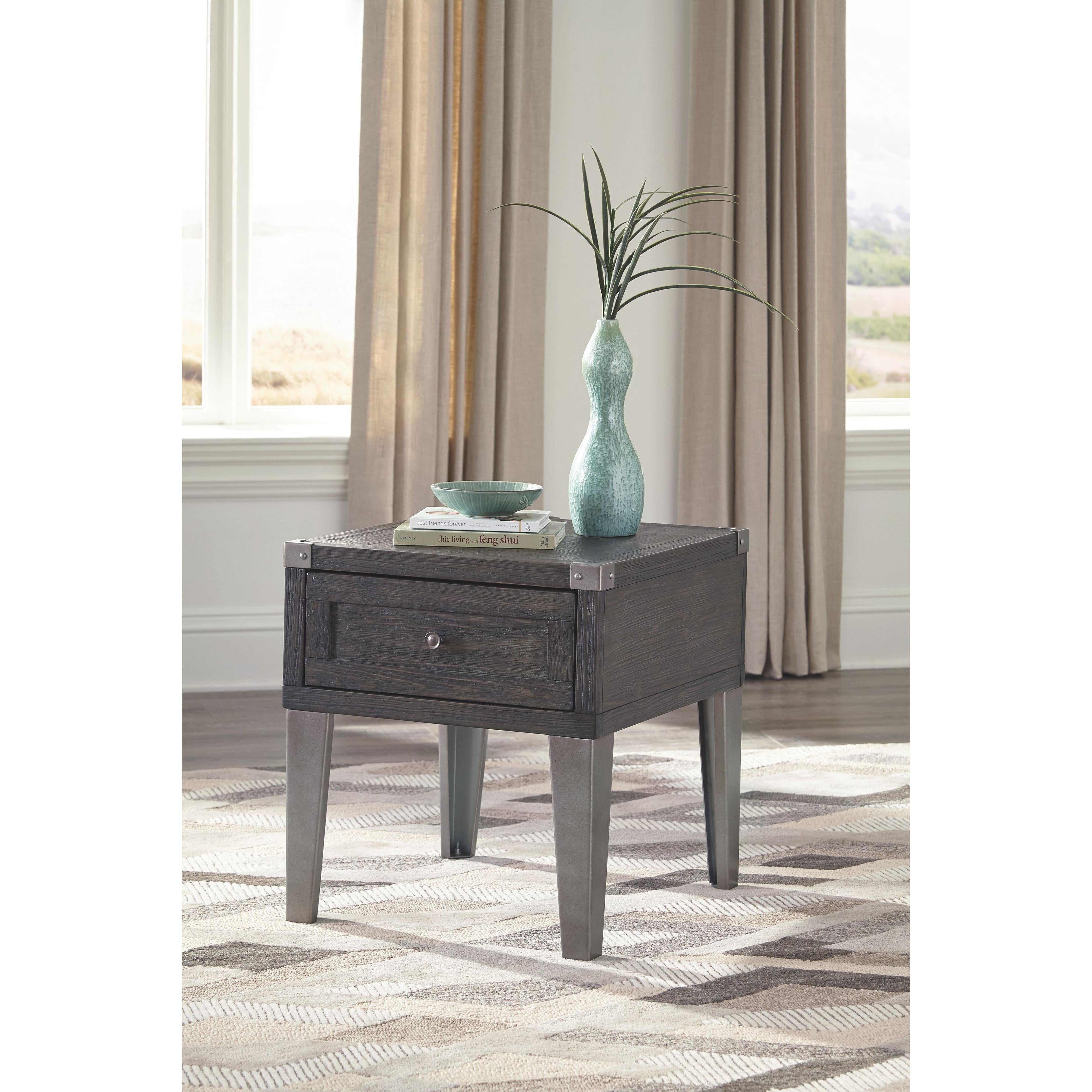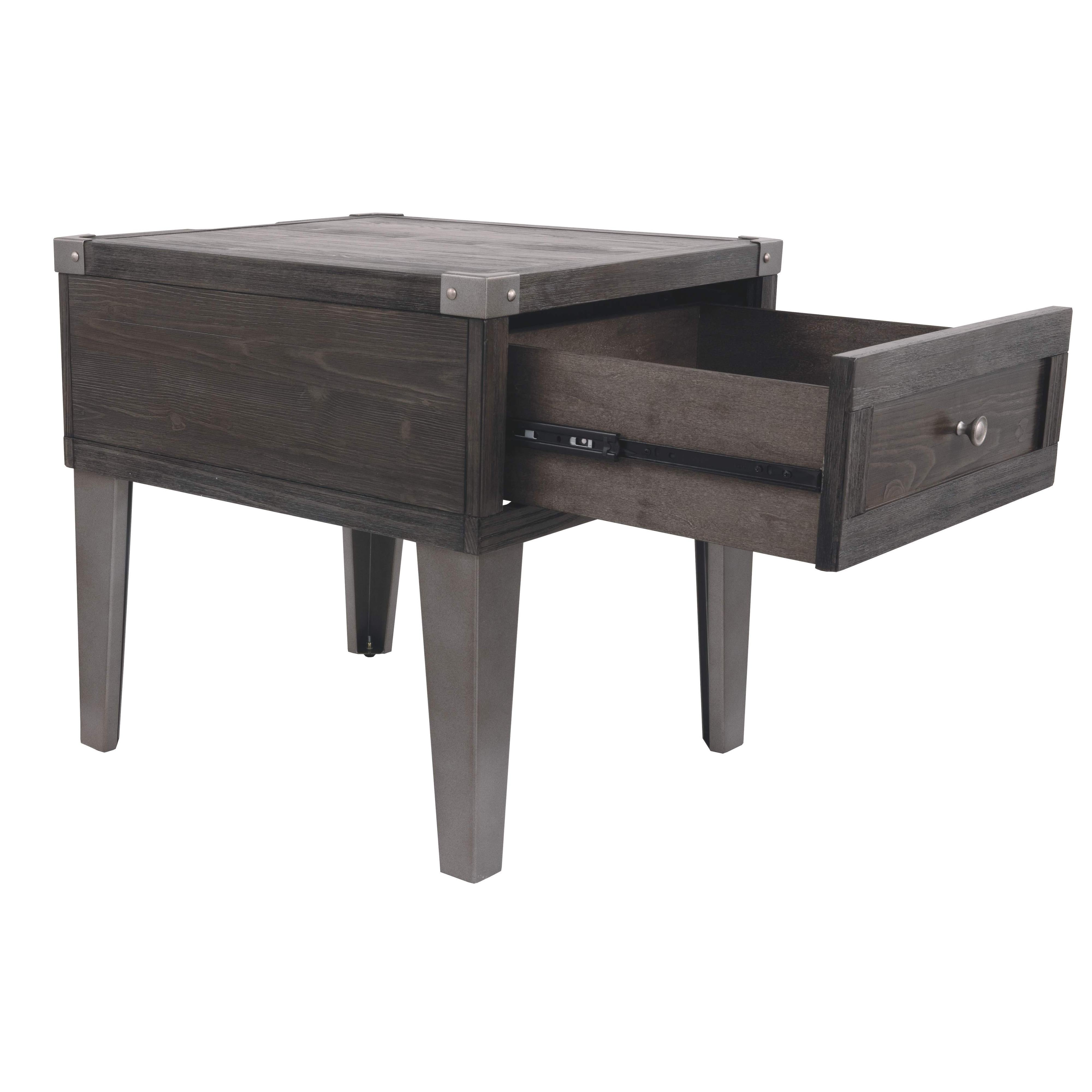 Take a stance for rustic-industrial style with this mixed material end table. Weather-washed pine wood and veneers are contrasted with canted metal legs and corner bracket accents for a uniquely chic merger of earthy beauty and contemporary flair. Power plug-ins and USB charging ports mounted on the back add practical function to great form.