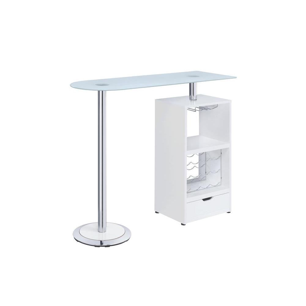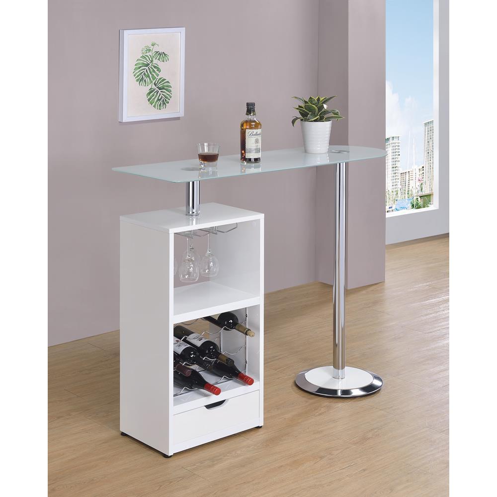 Create a relaxed spot for sipping a cocktail or catching up with a friend with this contemporary bar table. offering an appealing look and plenty of storage, the table features an elevated glass top with a cabinet under one side. in a glossy white finish, the cabinet delivers stemware storage and a wine rack, perfect for showing off favorite vintages. an included drawer in the base of the cabinet is perfect for tucking away bar accessories. relax with a friend or enjoy pouring a favorite merlot at this stylish bar table.