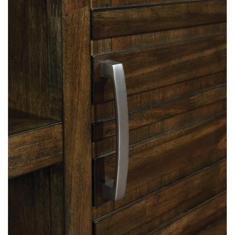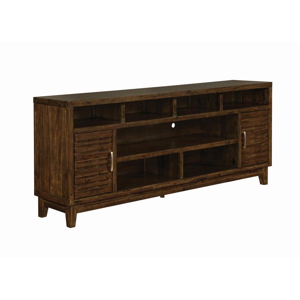 Textured door fronts add depth and character to this wood media console. a transitional design that works in rustic, casual and contemporary decor, the console features acacia wood construction. a rich rustic mindy finish ensures a rich, dimensional look to complement a living area or bedroom. brushed nickel hardware adds the perfect touch of polished appeal. cord management openings and plentiful shelving are ideal for multiple stereo and gaming components to tuck away neatly.