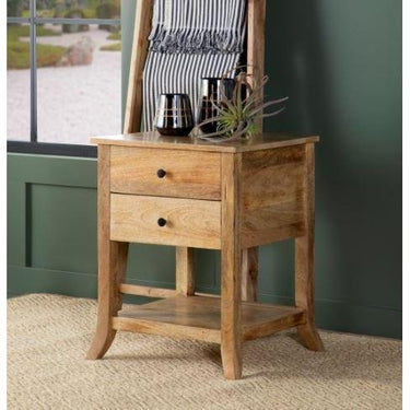 Minimally designed with sustainable features, drop this rustic accent table beside a chair or allow it to double as a nightstand beside a bed. built of eco-friendly mango wood, this accent table offers two spacious drawers to keep essentials organized and out of sight while displaying decor, potted plants or family photos along the tabletop. each drawer is adorned with a black round knob that lends an industrial touch. and an open bottom shelf allows decorative basket storage and easy-to-reach throws. the natural mango wood boats a charming woodgrain pattern of varietal hues and warm tones.