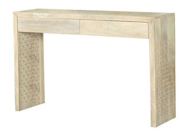 Built from solid mango wood for an eco-friendly touch to your home, this contemporary console table makes a striking statement piece in a space. designed with a lightly hued, whitewash finish, this console table lends itself nicely to a variety of color palettes and decor styles. plank side panels with a diamond-motif lattice cut outs offer a charming element to the simple, smooth surfaces of this understated furniture piece. two drawers offer room for storage and more, while a spacious tabletop keeps lamps, decor and more. place this lovely console table in a beach cottage foyer or allow it to double as a desk in a global-inspired bedroom.