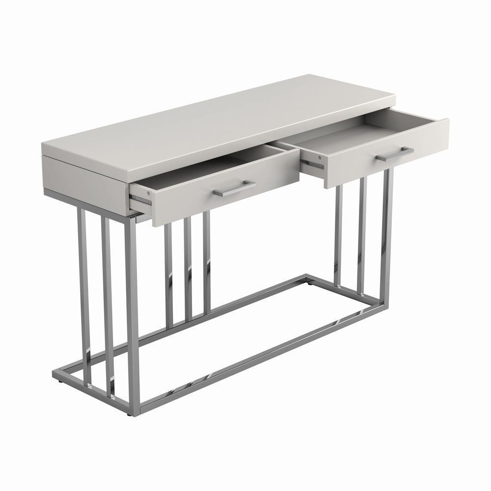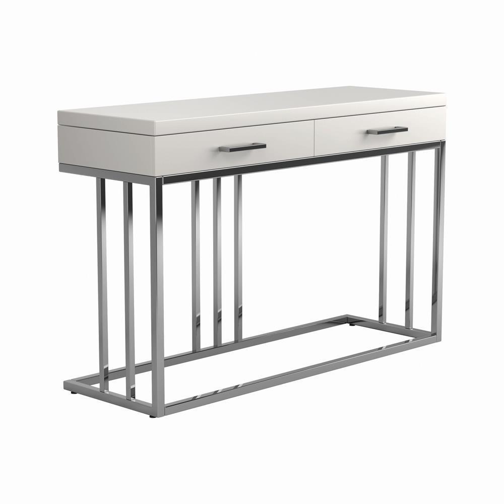 Celebrate the modern lifestyle with this sofa table. it brings you another piece to show your love for contemporary design. whether you place this sofa table behind your sofa or against the wall, the glossy white tabletop and metal base combines to present your style in a classy manner. drawers float open and shut on full extension glides. harmonizes well with matching coffee table and end table.