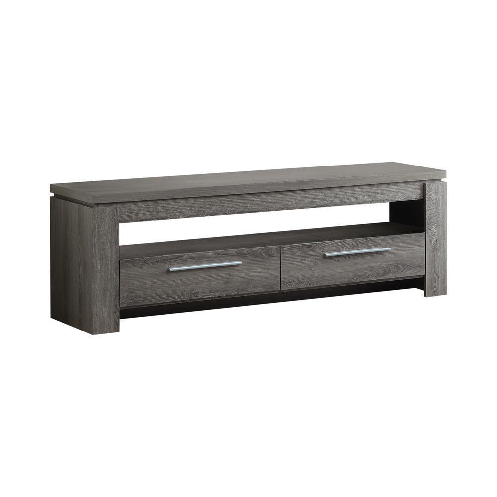 With a look of subtle glamour, this tv console blends effortlessly with a variety of decor styles. its stately silhouette is enhanced by a soft, weathered brown finish for a hint of understated class. a smooth, sleek floating top provides a sturdy surface, allowing plenty of room for a large television. stylish silver hardware rounds out its sophisticated look. with a large open shelf over two spacious drawers, this console offers a variety of convenient options to meet your storage needs.
