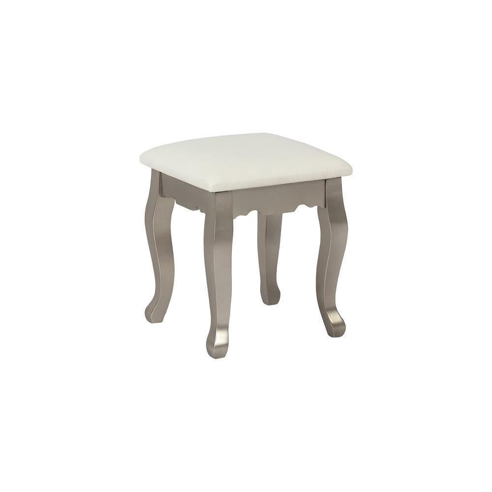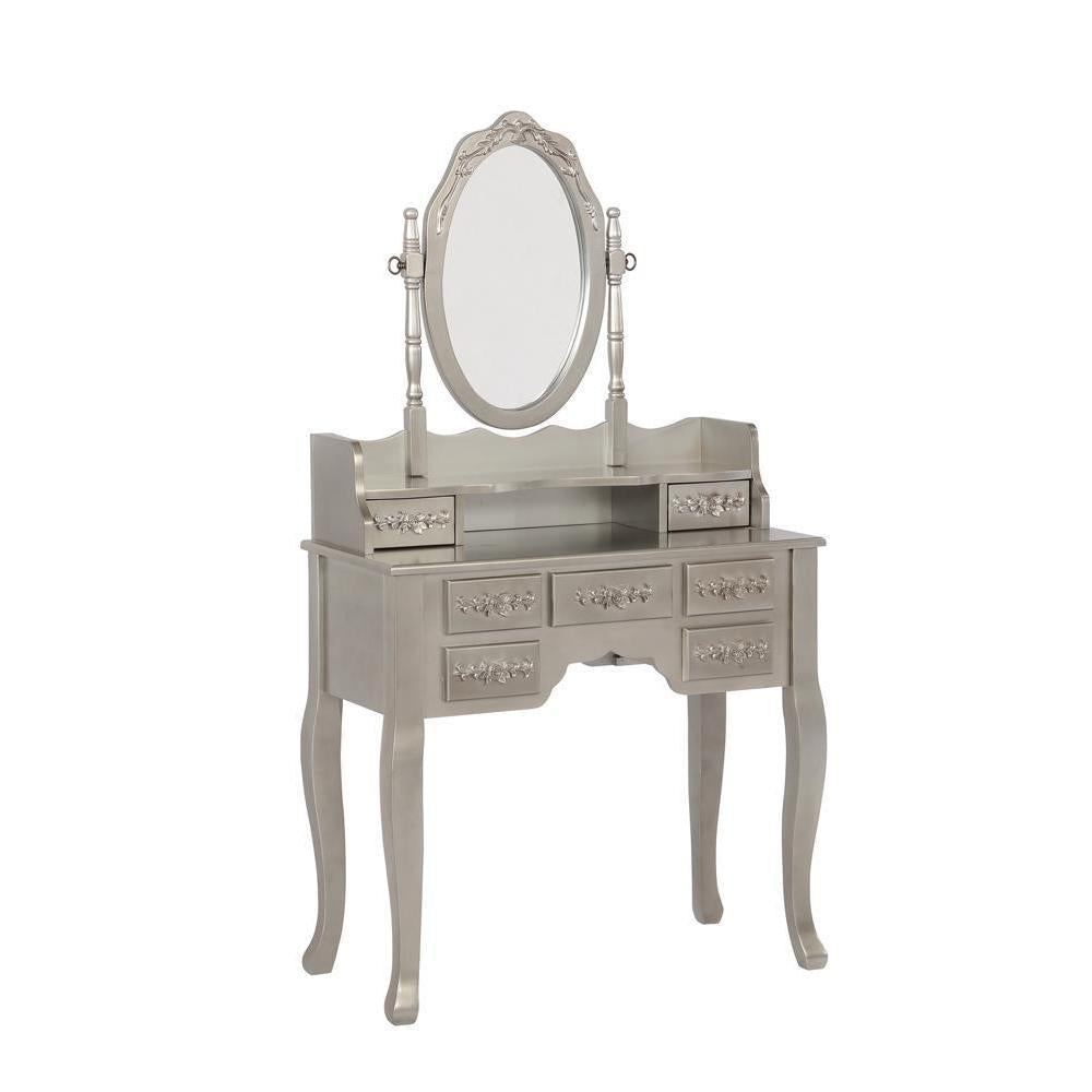 Visually striking, this three piece vanity set elevates a bedroom with glamour. the shiny silver finish emphasizes the curves in the legs of the desk and stool. the seven drawers on the desk feature an intricate floral wood carving, full of chic detail. a curve in the middle of the hutch offers storage options on both the desk and below the mirror. with an oval silhouette, the delicate mirror is also decorated with an ornate floral design and is supported by two carved posts.