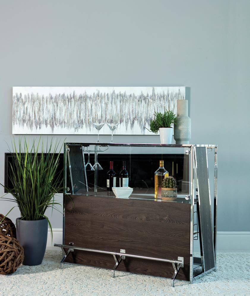 Treat your decor to the bold, modern luxury of this beautiful, dark oak bar unit. tastefully traced with lines of gleaming chrome, it's an elegant choice for anyone who likes to entertain. this stunning piece features clear tempered glass shelves to organize barware and party essentials. stemware racks and wine bottle racks provide even more options for organization. this metal and glass bar unit is especially ideal for a rec room, game room, or dining nook.
