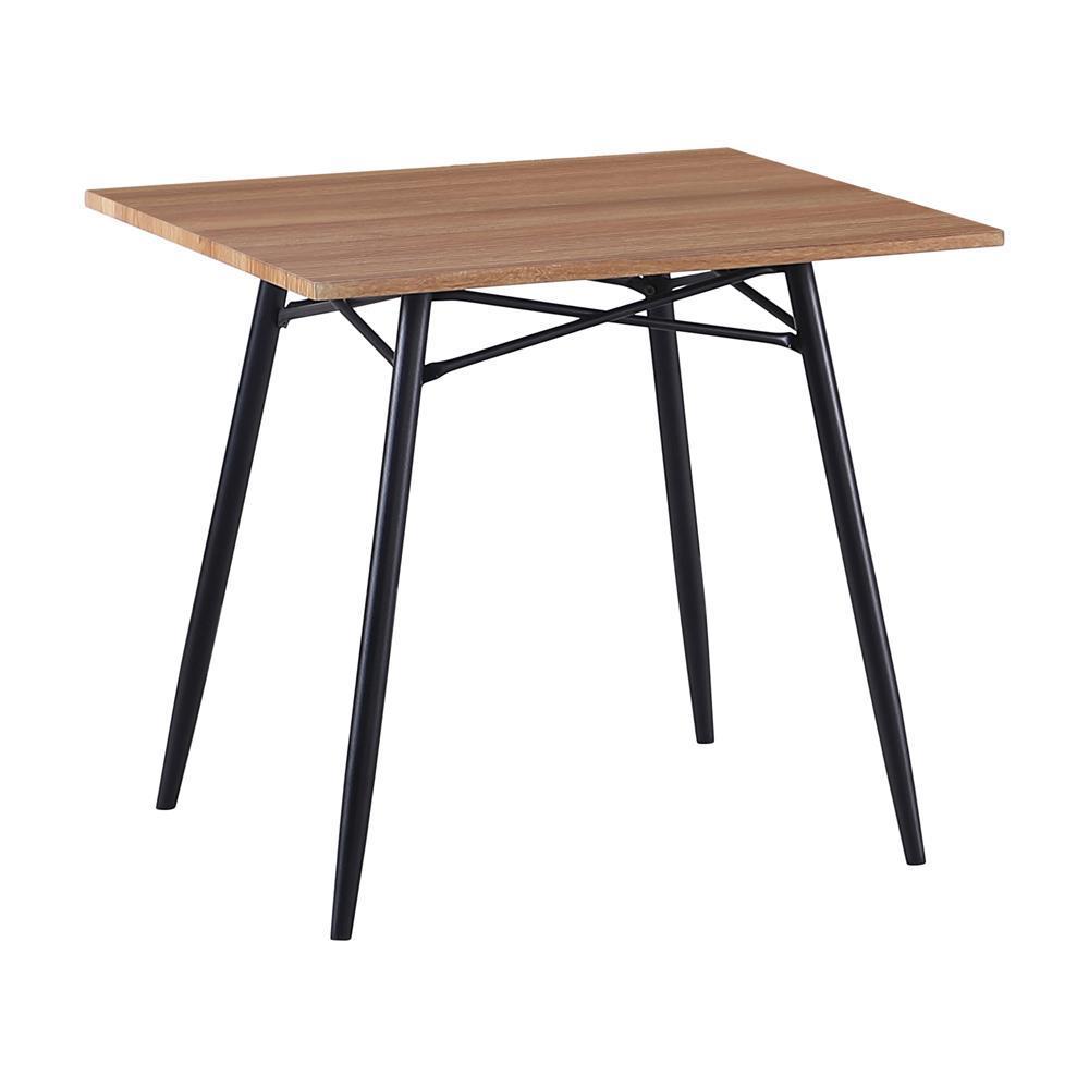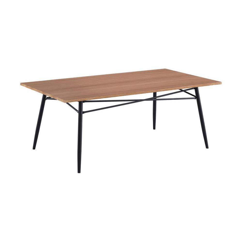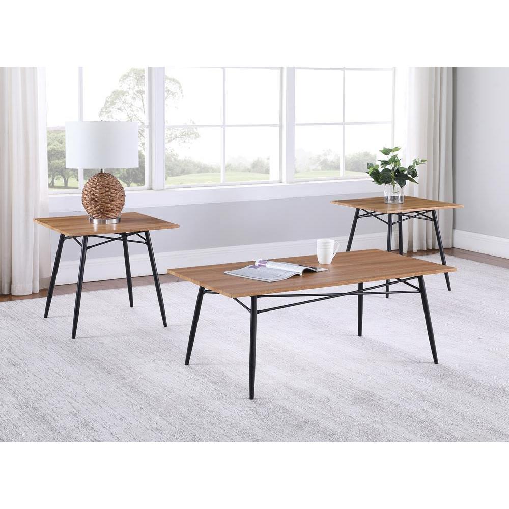 Complete your living space with a three-piece occasional set. coming in a trio of a coffee table and two end tables, you'll find all the space you need for table lamps and displaying decor. each piece is finished in a versatile light brown finish. the black metal base is supported on tapered legs with intersecting details on the frame. bring this occasional table set to your living area for a blend of modern and industrial.