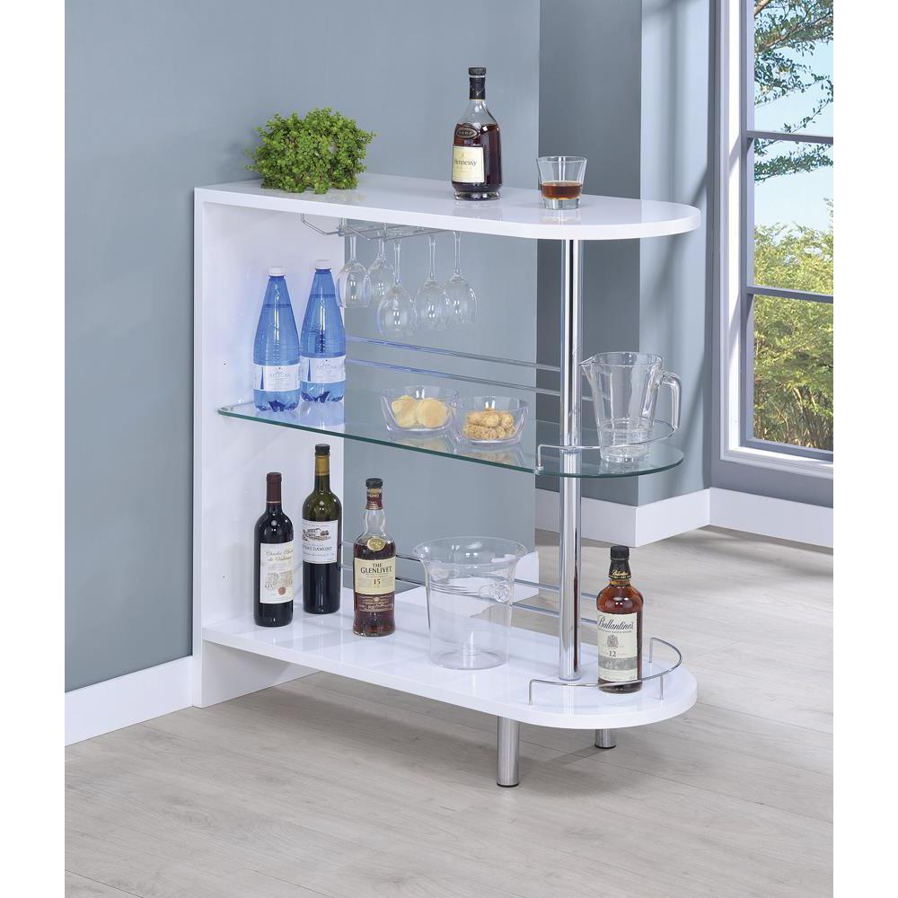 Liven up your next gathering with this attractive, contemporary bar unit. with a sleek design and a smooth, glossy white finish, it has a modern and glamorous look. two tempered glass shelves provide lots of space for storage, while a built-in stemware rack adds extra convenience. it comes complete with metal guard rails to safely keep bottles and supplies in one place. crafted from high-quality materials, this sophisticated unit is a stylish and convenient upgrade for your entertaining needs.