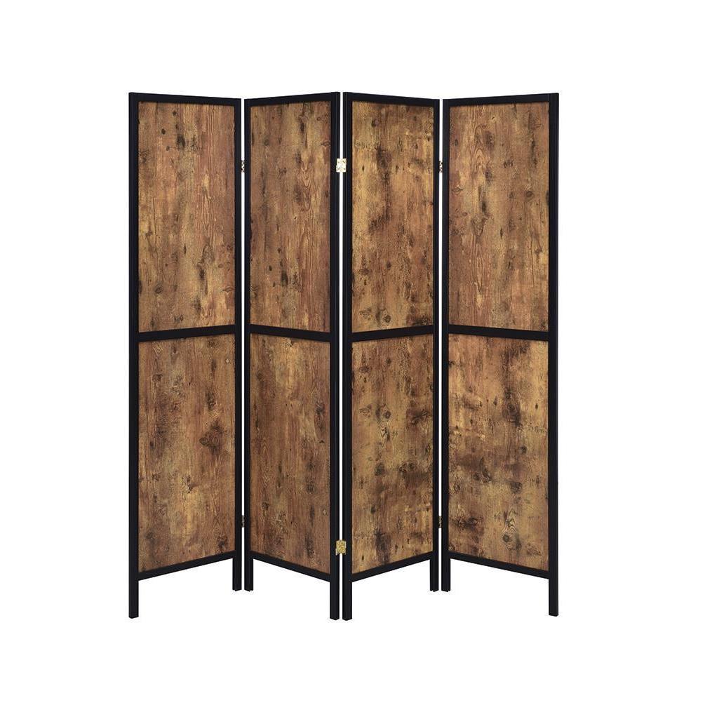 Separate a classic space with this warm four-panel screen. sleek and clean, the legs feature a dark finish that adds structure to the divider. in an antique nutmeg finish, the panels showcase an exposed wood grain that adds depth to any shared bed or living room. warm and rich, this screen combines rustic charm with smooth modern details. bright metallic hardware connects the panels, allowing for versatility in position.