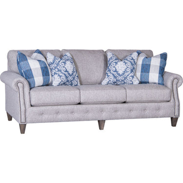 Add timeless charm to your living space with this stylish sofa by Mayo Furniture. Upholstered in the inviting Runaround Stone fabric, this piece combines classic design with everyday comfort. It features gracefully rolled arms, tapered wooden legs, and generously padded back and seat cushions for a cozy yet supportive feel.
