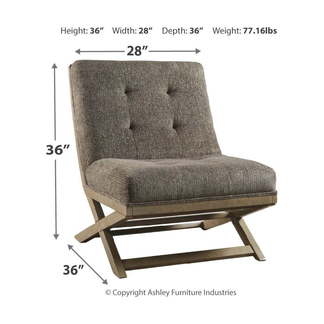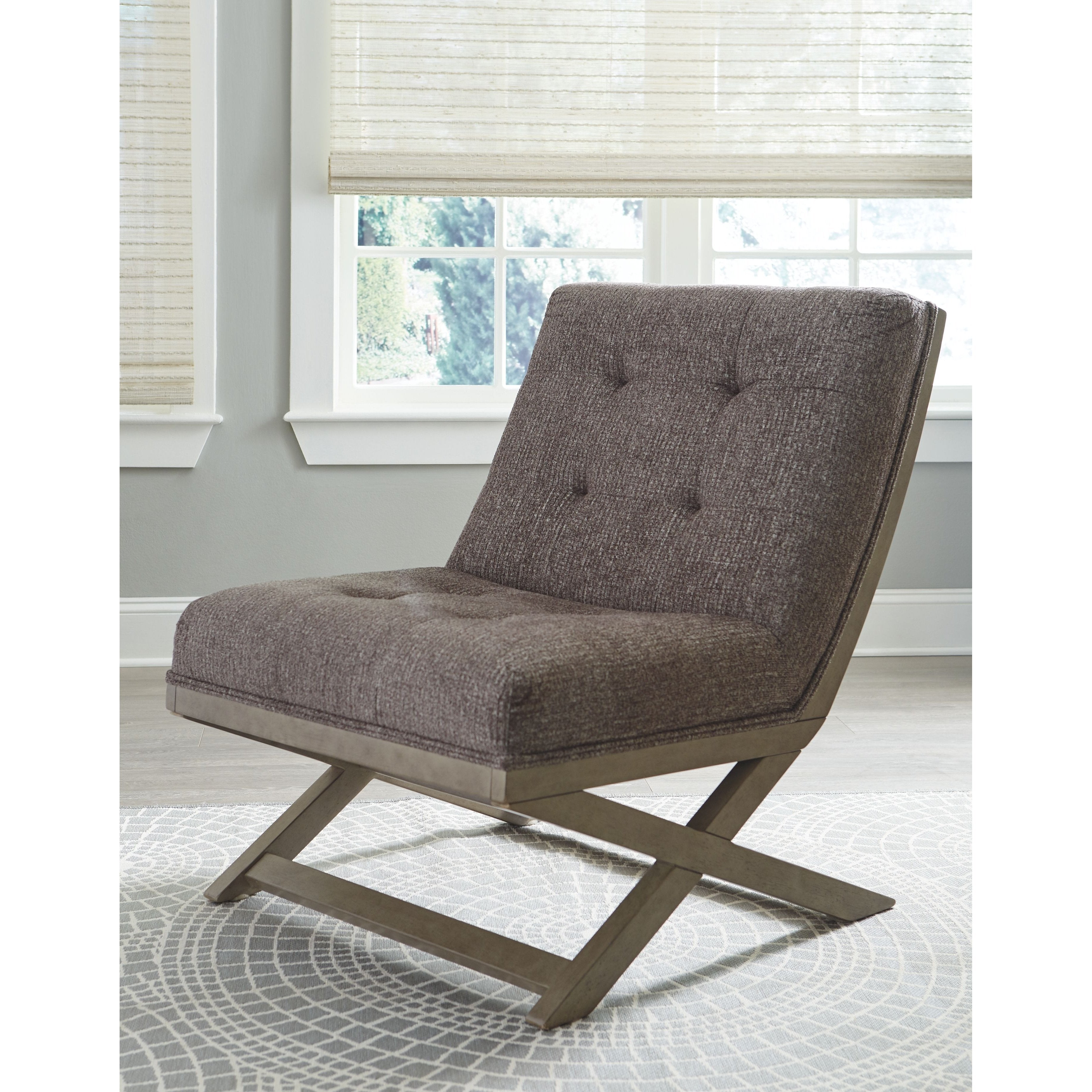 Take a comfy seat in this fashionable accent chair. Upholstered in a blue polyester blend fabric, you’ll love the way it feels. Tufted back adds a classy design element. Armless profile with “X” base makes it the perfect companion for open spaces.