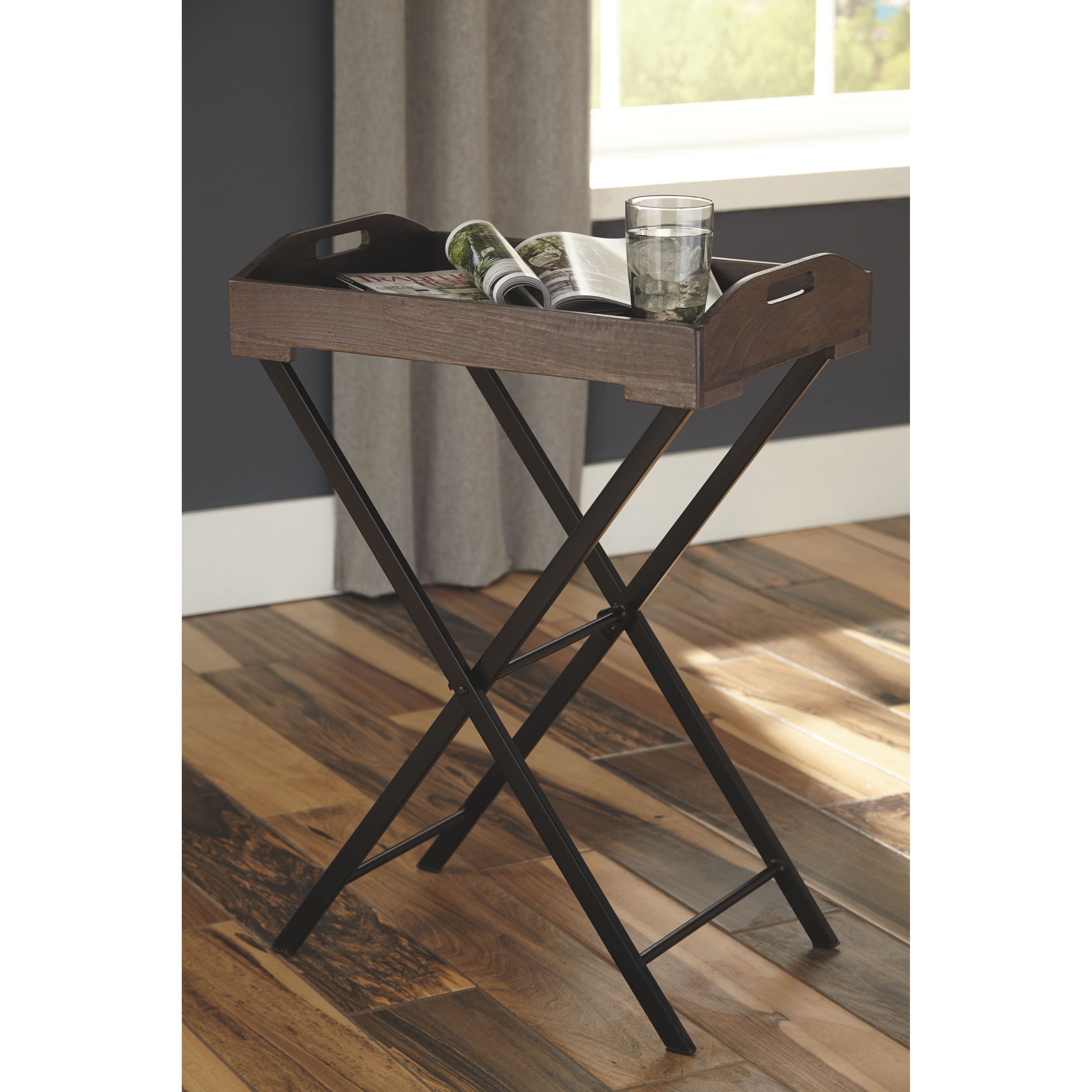 Bring your food to you with the modern farmhouse Cadocridge accent table. Removable wooden tray holds your food and beverages wherever you are. Antique gray finish of the wood embraces the beauty of natural elements. You’ll love the ease of folding the black finished metal base to put away when you’re done.