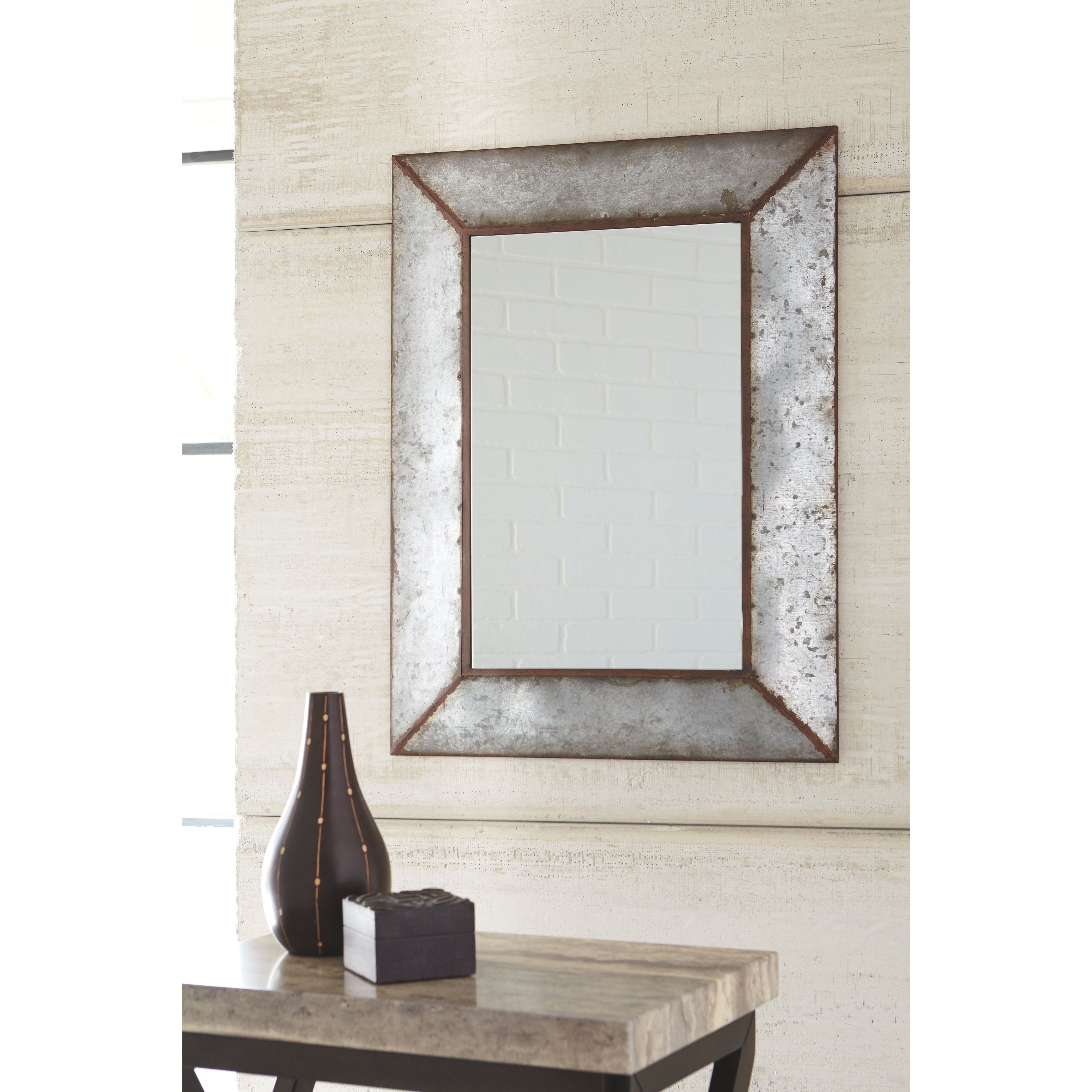 Modern industrial style is looking better than ever in this accent mirror. Fusion of antiqued galvanized metal with bronze-tone weathered edging is a beautiful reflection of timeworn beauty.