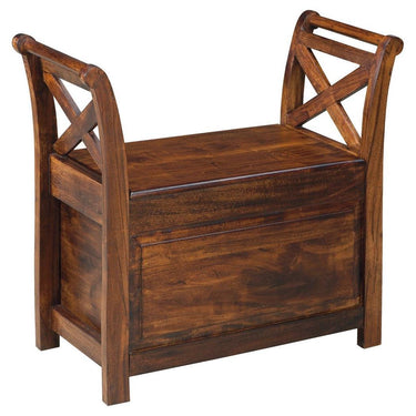 The extraordinarily rich finish of this bench is just the beginning. Quality construction with select wood gives this piece great staying power. Gently sweeping sides with classic X-braces frame a sweet place to sit a spell. Simply lift the hinged seat to reveal handy storage: perfect for keeping treasures tucked away yet close at hand.