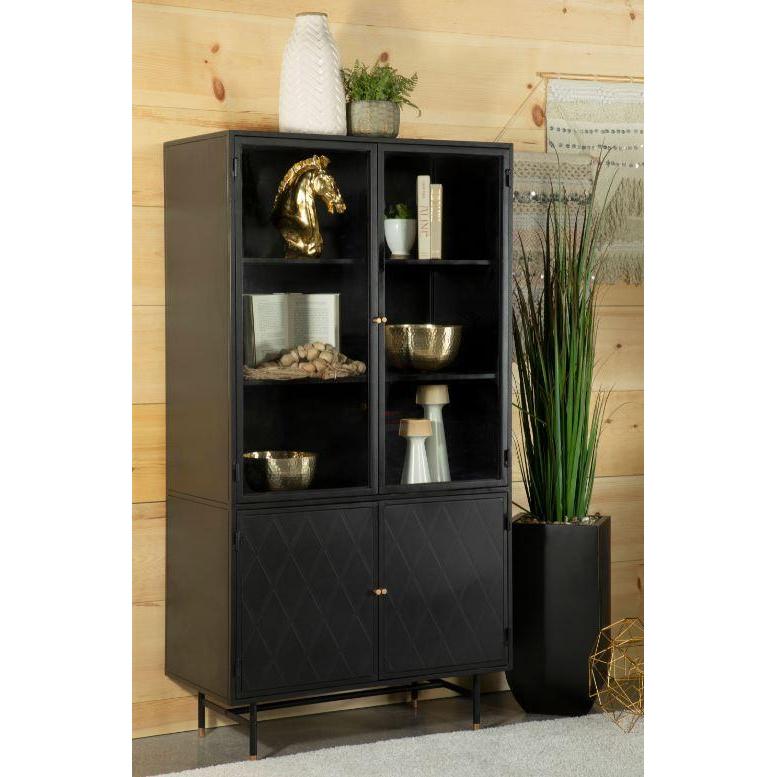 This industrial style metal cabinet offers ample storage space and a bold look in a space. with its matte black finish and accents of antique brass finish hardware, the cabinet offers a subtle contrast while exhibiting style and grace. with its tall design and rectangular shape, this cabinet takes up minimal floor space, bringing the eye up to showcase decor and collections behind tempered glass doors. adjustable shelves and interior shelves behind the bottom cabinet keep everything from barware to throws and linens. resting on a trestle base with legs capped in a matching antique brass finish hardware, this elegant and stately accent cabinet offers a touch of glam too.