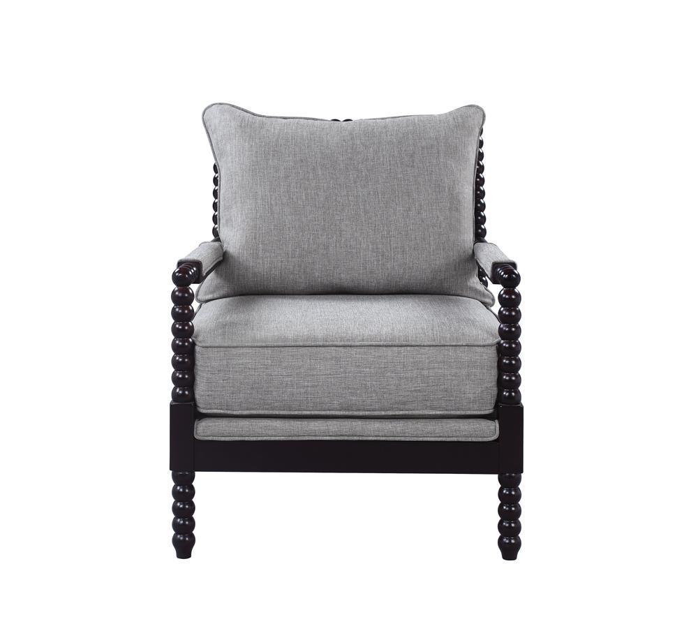 Careful attention to design detail brings a truly stylish look. ornate elements on this accent chair offer an artistic feel that blends easily in a transitional space. a slender frame with a black finish features sweet beading to deliver romance and attitude. a lovely grey upholstered seat base and back pillow keep it simple and elegant. stylize a family room or den with this charismatic chair.