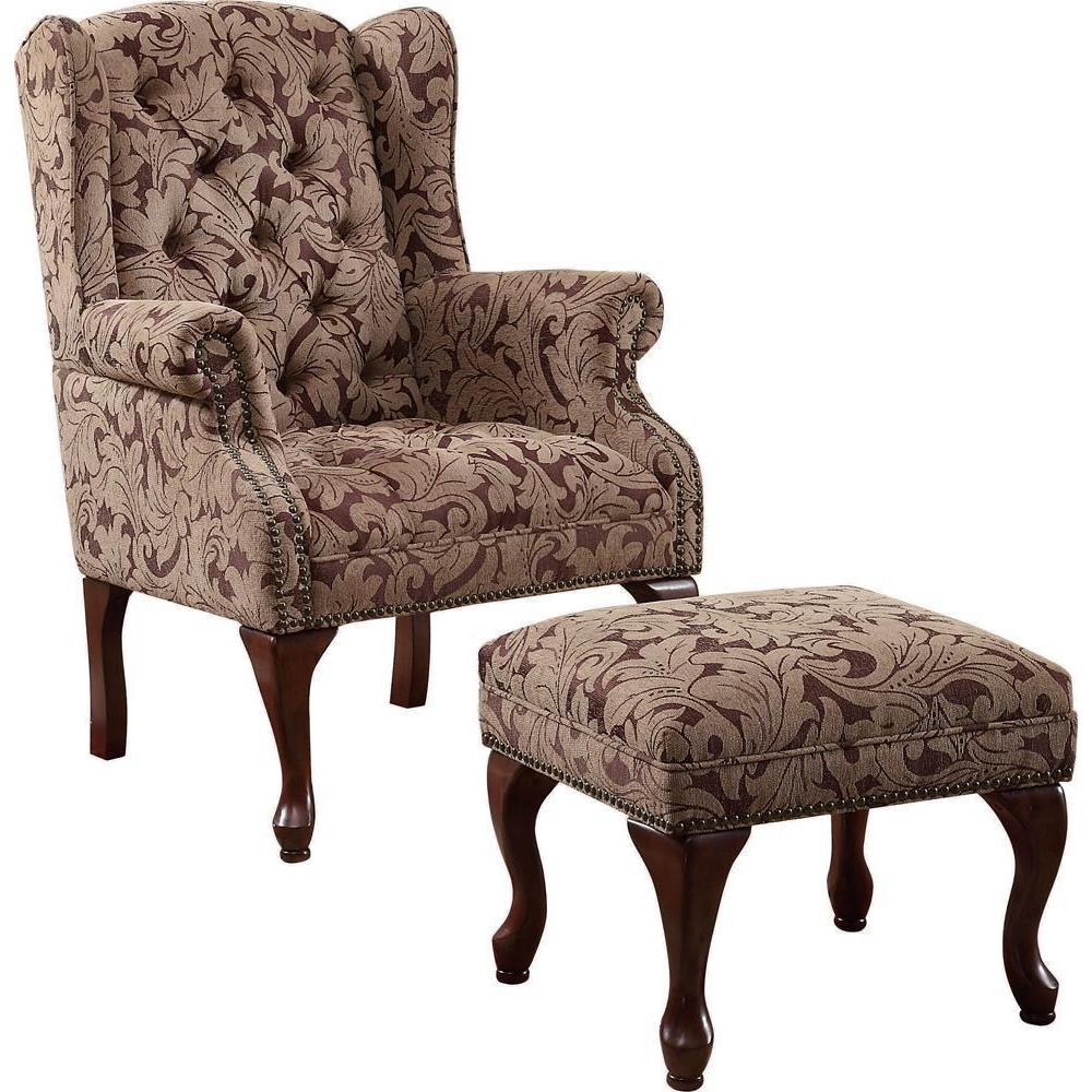 A long day never felt so good once you sink into this traditional chair and ottoman set. accent chair is a traditional wingback chair that beckons you to nap and unwind. tufted back and seat wrap you in comfort. rolled arms are thick and plush. both ottoman and chair are crafted with sumptuous fabric and nailhead trim for eye-catching appeal.