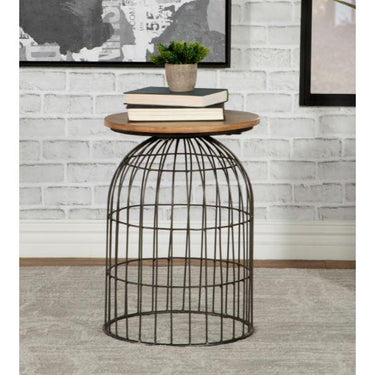 A cage-like base offers an open, airy vibe to this rustic accent table. topped with a natural beige marble tabletop in a round shape, this accent table offers up industrial style elements and modern farmhouse vibes with its bird case-inspired design. the wireframe base rests flush on the floor and supports a round tabletop, the perfect amount of room for a refreshment or reading material. place this chic accent table next to a wingback chair for a country flair. or place it within a corner as a plant stand for your favorite greenery.