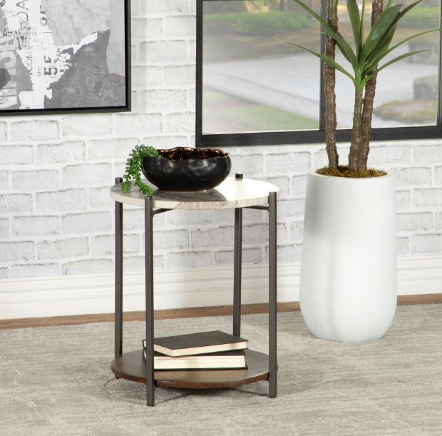 Mixed materials and sleek lines come together to create this transitional accent table. featuring a round shape and straight, slim frame supports, this accent table supports books, refreshments and more with its tabletop and open bottom shelf. the disc-like tabletop is made of a white marble with elegant striations, cradled by an x-style metal frame in a dark gunmetal finish. the bottom shelf invites you to keep baskets off to the side, and offers a warm brown wood finish for a natural element. place this versatile accent table in bedroom for a nightstand, or allow it to be used as a plant stand for your favorite flowers and greenery.
