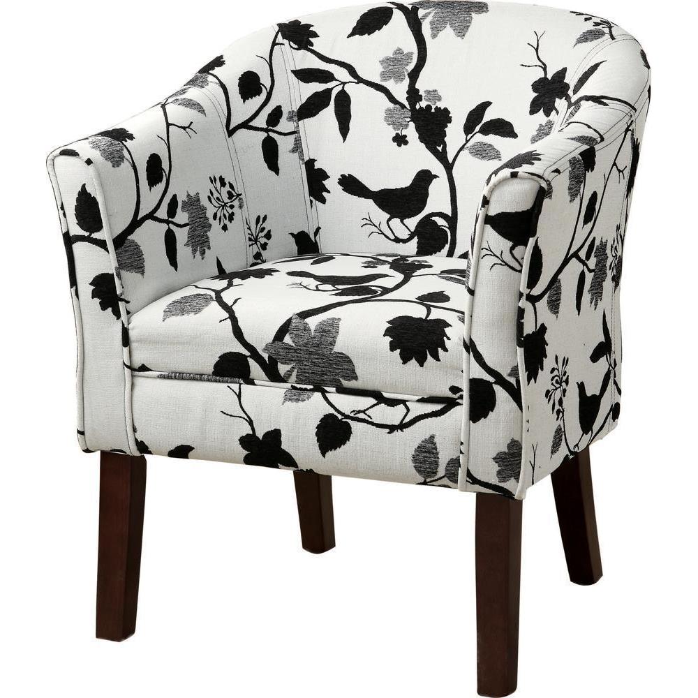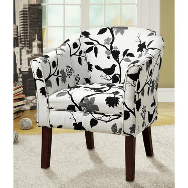 This accent chair gives you the chance to express your style. it comes in a thrilling bird and branch pattern fabric that livens up a casual living room. the bird and branch are black and grey set against a white background for a contrast that starts conversations. chair has a barrel back and flared arms for comfortable seating. leg finish is dark cappuccino for a further touch of distinction.