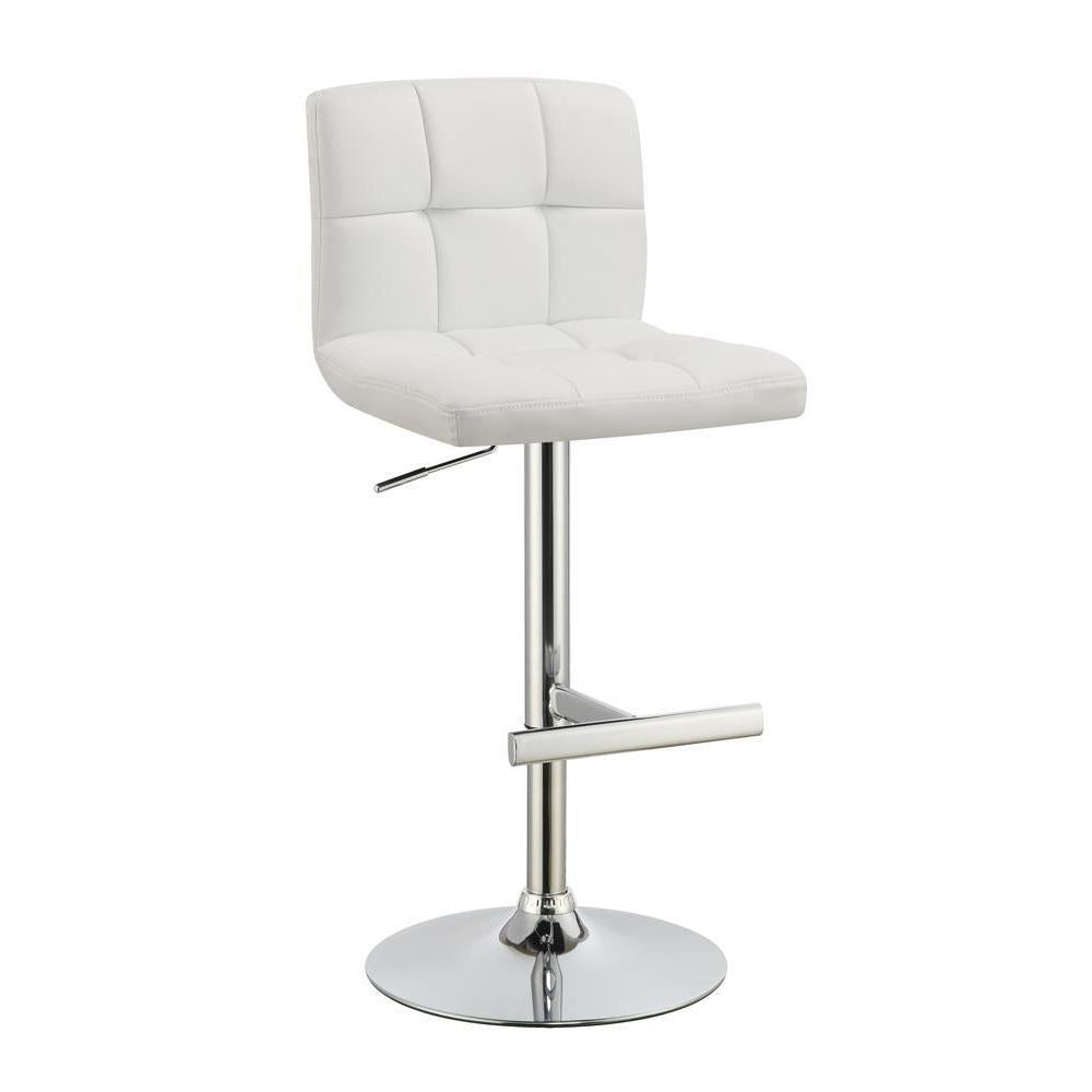 Cool white upholstery reinforces the modern silhouette of this height adjustable barstool. accommodating a wide range of counter and bar height tables, the stool features easy height adjustment with a single lever just under its seat. square tufting enhances a contemporary profile. its metal base boasts a t-shaped footrest with a rounded foot. perfect for a glass-topped bar table or a supremely modern kitchen island.