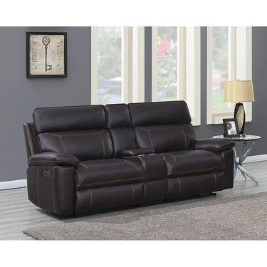 You found the new star attraction of your living space with this dual power loveseat. incredibly upholstered in a sleek and versatile leatherette fabric, the contrasting stitching offers plenty of stylish appeal. this piece is designed for total comfort, engineered with foam seating and tufted armrests. meanwhile, a center console offers an area to store remotes. place two beverages in the accompanying stainless steel cup holders for complete convenience.