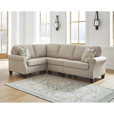 Whether your home is adorned with contemporary or American classic furnishings, this sectional has a timeless sense of elegance that's sure to fit right in. Signature elements include roll arms and cutaway side profiling for added flair. Ultra neutral and plush to the touch, the sesame-hued fabric is a brilliant reflection of your good taste. Rounded cornering gives the box cushions a softened, tailored aesthetic. Designer pillows pop with colorful patterns to round out the inviting look.