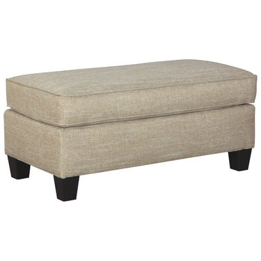 This ottoman brings a classic look beautifully into the present. Loaded with multi-tonal interest, the ottoman's wheat-hue upholstery is a fresh choice in neutrals. Clean-lined tapered feet in a dark finish infuse modern appeal.