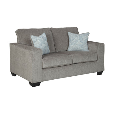 If style is the question, then this striking loveseat is the answer. Sporting clean lines and sleek track arms, the decidedly contemporary profile is enhanced with plump cushioning and a chenille-feel upholstery that's so pleasing to the touch. Sure to play well with so many color schemes, this loveseat in richly neutral alloy includes a pair of understated floral pattern pillows for fashionably fresh appeal.