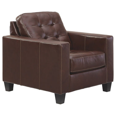 Tailor your space with the tidy structure of this chair. Decorative stitching and button tufting on the box cushion make for a very neat appearance. With real leather covering the seating area-where it matters most-this piece has skillfully matched leather elsewhere, so you won't get hemmed in by the price.