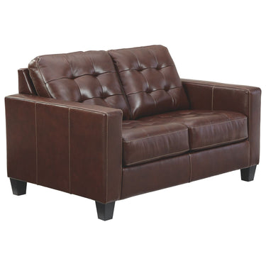 Tailor your space with the tidy structure of this loveseat. Decorative stitching and button tufting on the box cushion make for a very neat appearance. With real leather covering the seating area-where it matters most-this piece has skillfully matched leather elsewhere, so you won't get hemmed in by the price.