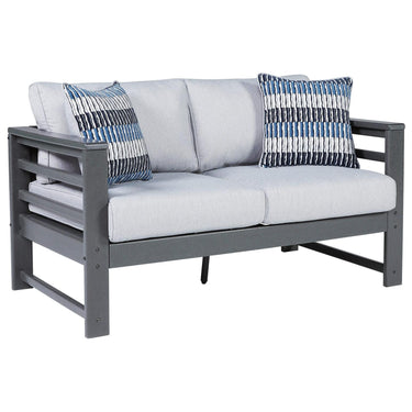 Indulgently comfortable furniture shouldn't be limited to inside spaces. Create your own outdoor oasis with this cushioned loveseat. A study in form and function, the trend-right charcoal gray frame is crafted from MEGA TUFF� HDPE material for durability and weather resistance. Cushions wrapped in high-performing Nuvella� fabric are comfortable and carefree.