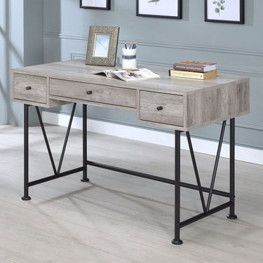 This attractive writing desk combines minimalism with industrial economy. it features three drawers with plenty of storage space and dark hardware. table top has handsome wood grain accents and enough table top space for a laptop or monitor and a table lamp. it features a dark metal frame and legs. finished in a contrasting grey driftwood design that's well suited to a well-lit office space.