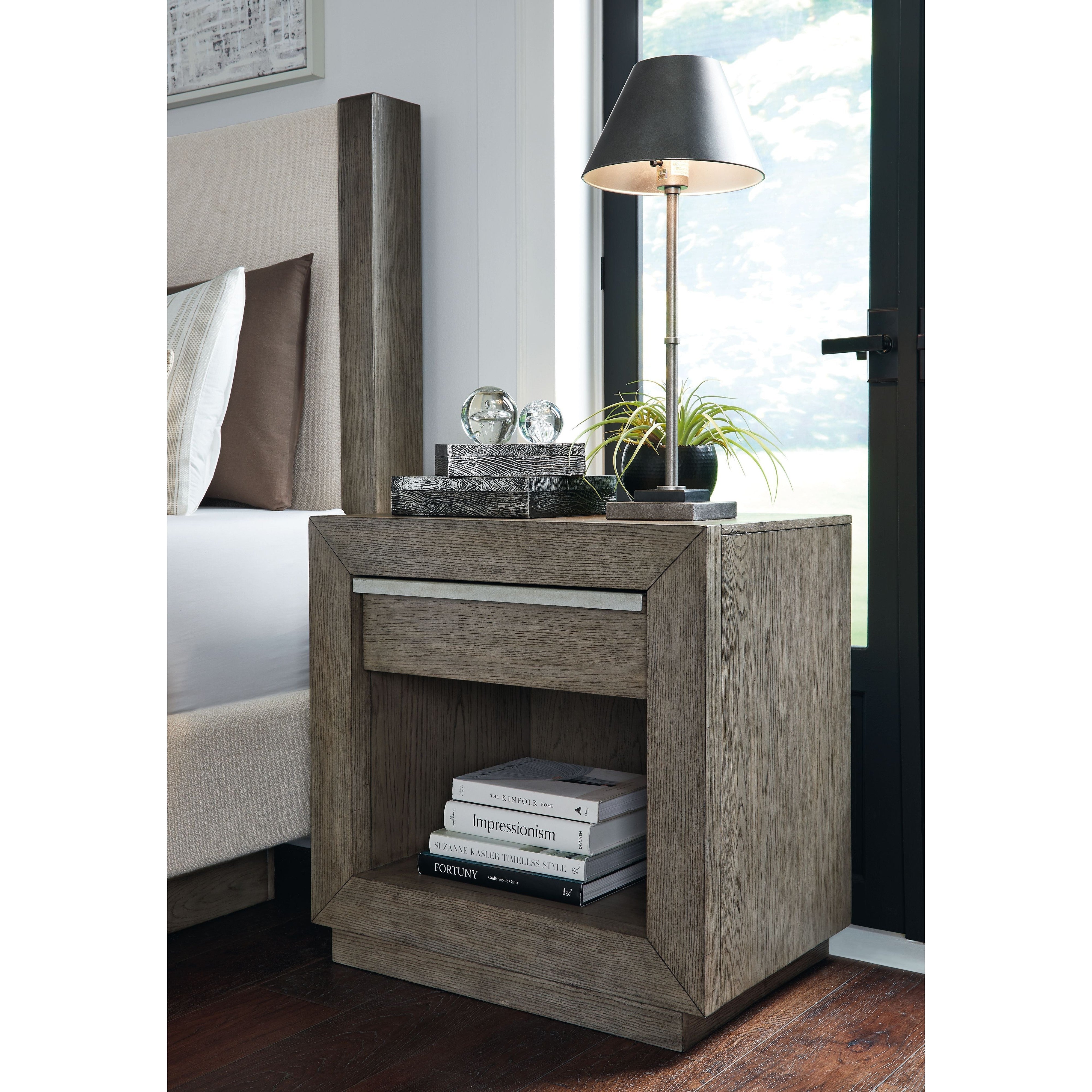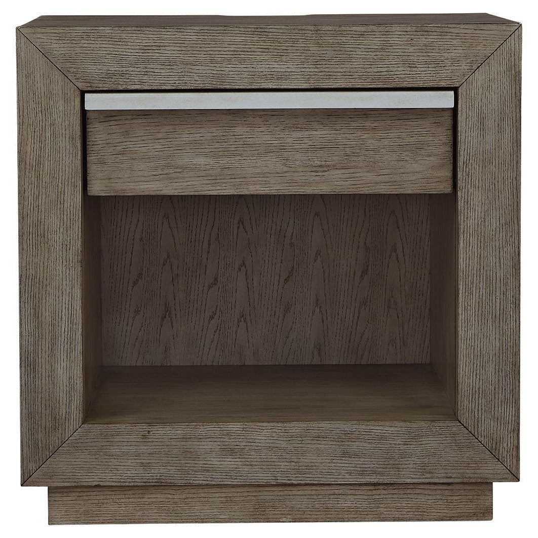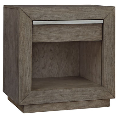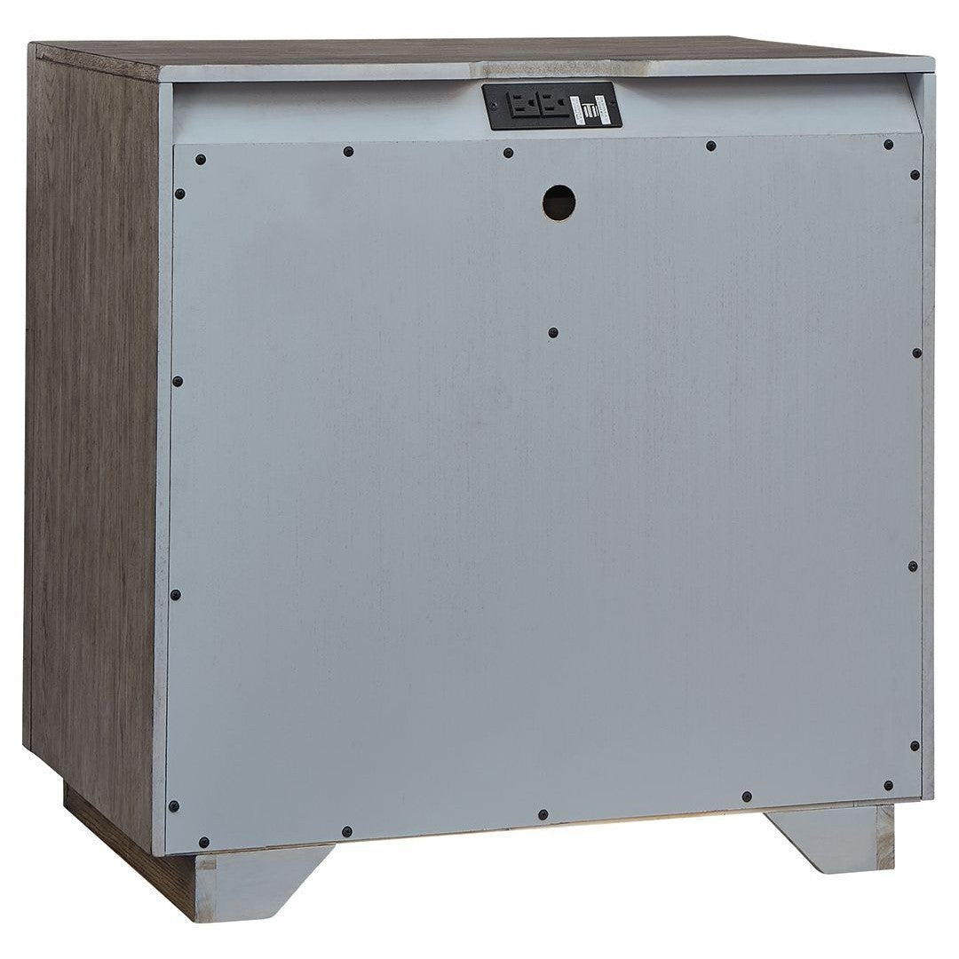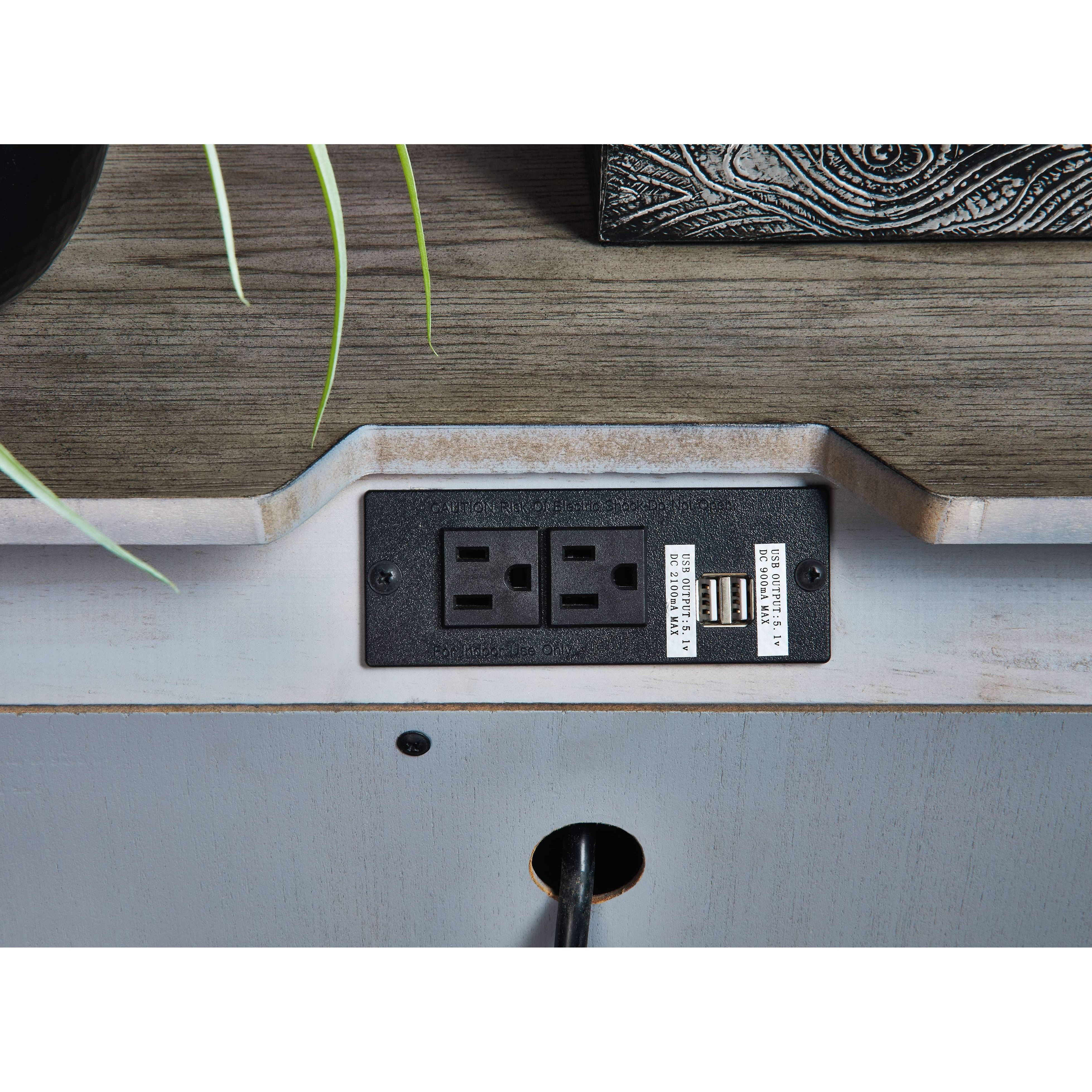 Strike the perfect balance of refined and relaxed with this nightstand. A full length pewter-tone bar pull looks sleek against the weathered gray finish, while the open lower shelf provides additional storage space. A picture frame front further elevates the piece's modern flair. Built-in dual USB port and AC power allow you to charge up in style.