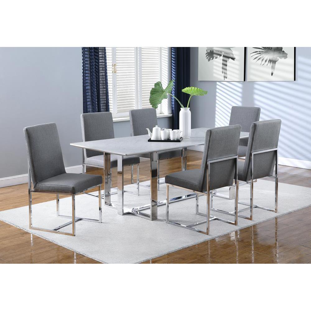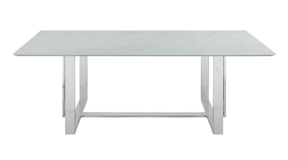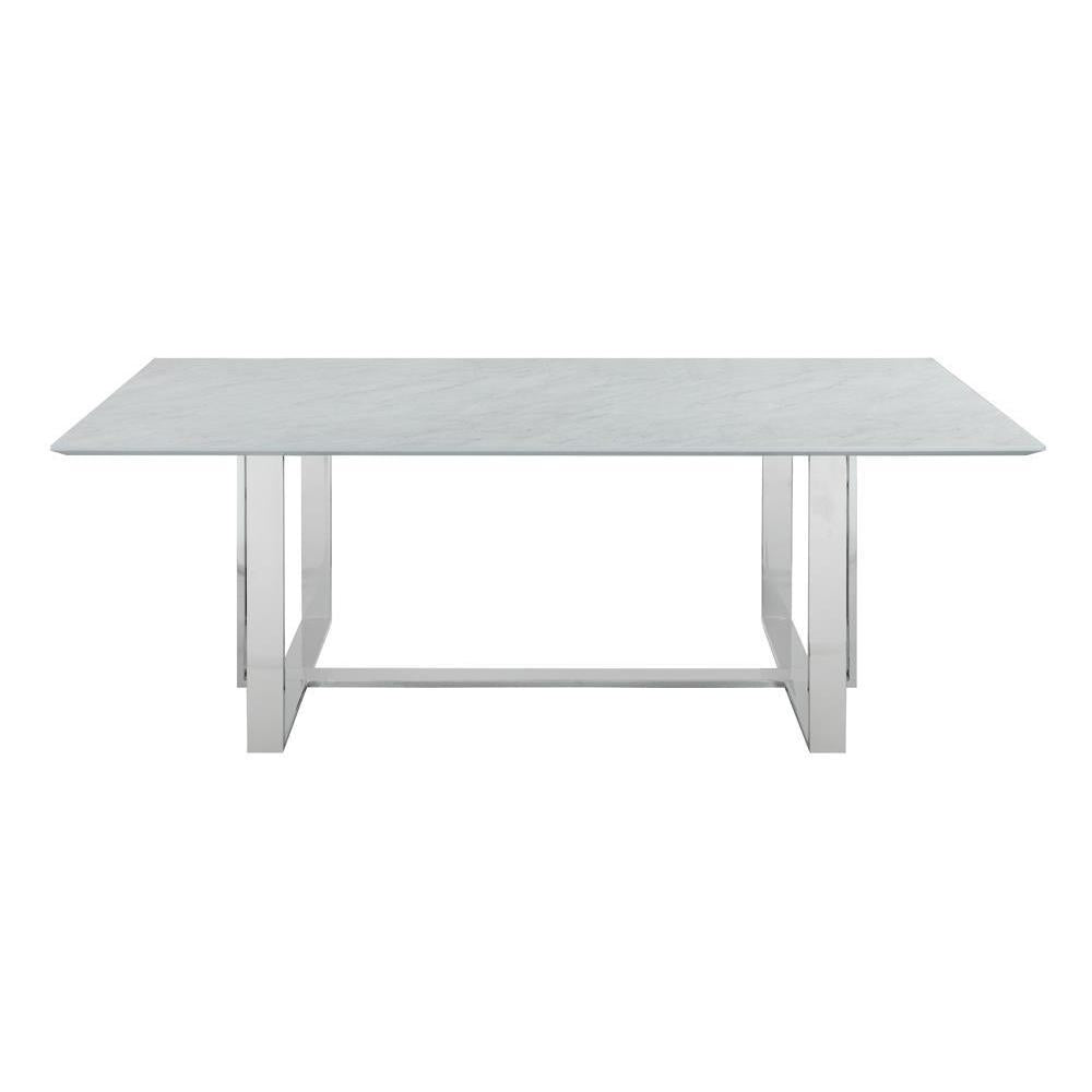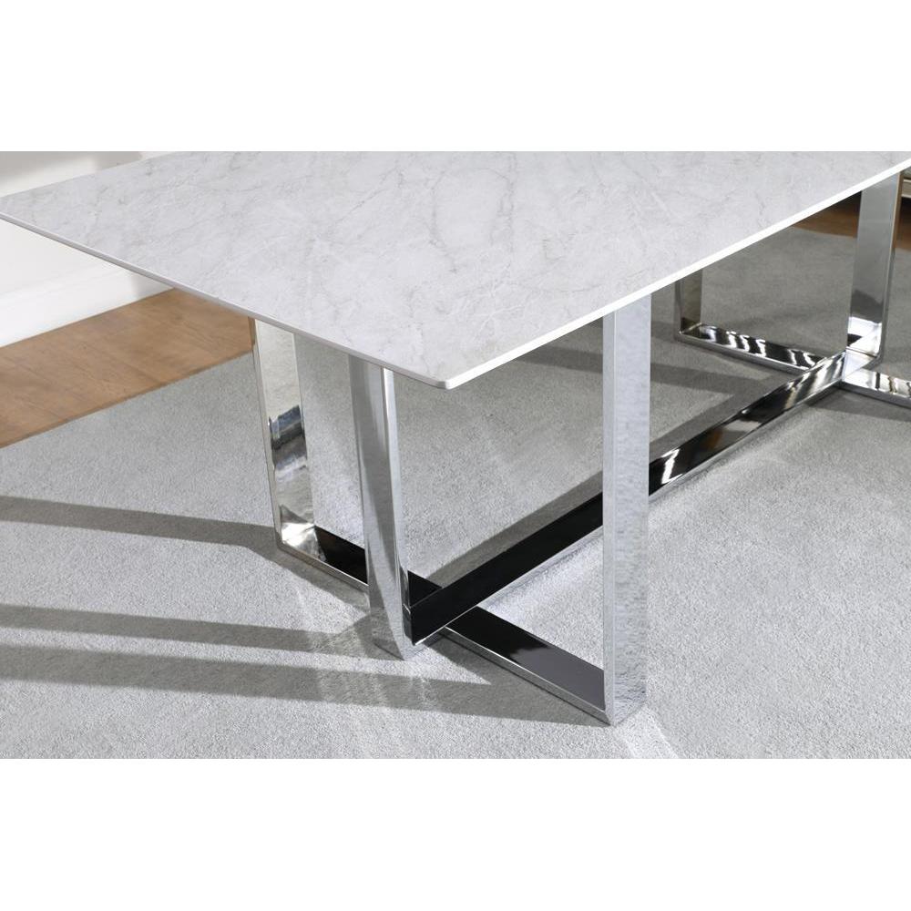 Ultra-modern and versatile, this rectangle dining table features a minimal design and a clean silhouette. capable of seating up to six, is spacious tabletop features a thick, tempered glass and a faux marble design. plus, the top also offers a heat resistant and water-resistant material, able to withstand warm plates and spills. the trestle-inspired base is made of slim braces in a lustrous chrome finish. elevate this dining table with elegant centerpiece for a more formal room.