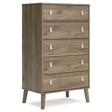Dare to take minimalism to the max. This chest of drawers has a richly relaxed feel thanks to its honey brown finish over replicated wood grain. Magnificently mod splay legs are a compelling complement to the streamlined design. And with two sets of faux leather drawer pulls that allow you to customize the chest to suit your space, there's no doubt about it: This contemporary piece is sure to become a classic.