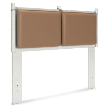 Dare to take minimalism to the max. This full panel headboard has an air of sleek simplicity thanks to its white painted finish with subtle replicated wood grain. The optional reversible cushions are an inventive element, allowing you to choose brown faux leather or gray fabric to suit your space. There's no doubt about it: This contemporary piece is sure to become a classic.