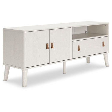 Dare to take minimalism to the max. This TV stand has an air of sleek simplicity thanks to its white painted finish with subtle replicated wood grain. A drawer, open shelf and cabinet provide just the right amount of living room storage, while magnificently mod splay legs compellingly complement the streamlined design. And with two sets of faux leather pulls that allow you to customize the TV stand to suit your space, there's no doubt about it: this contemporary piece is sure to become a classic.