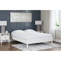 Dare to take minimalism to the max. This queen platform bed has an air of sleek simplicity thanks to its white painted finish with subtle replicated wood grain. Magnificently mod splay legs are a compelling complement to the streamlined design. There's no doubt about it: This contemporary piece is sure to become a classic.