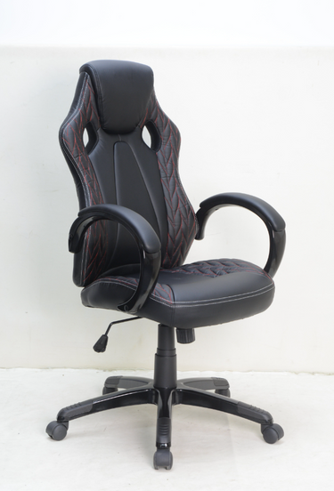 Perfect for a modern home office, this contemporary office chair is wrapped in a black leatherette that offers a bold statement piece. accenting the black leatherette is a botanical-inspired herringbone pattern with a red stitching details, giving a subtle pop of color. rounded padded arms provide a place to rest your elbows, while a padded headrest and seat offer long-lasting all-day support. mounted to a rolling base with five wheels, this mobile office chair easily glides throughout the office space to retrieve items and more. in addition, this office chair can be adjusted, lifted to fit your preferable desk height.