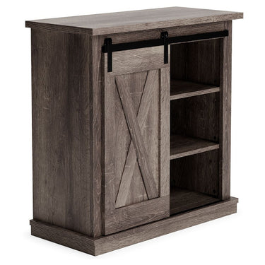 This accent cabinet is a tasteful blend of contemporary style with traditional charm. Constructed of engineered wood in an antiqued gray wood grain effect laminate, this cabinet sports a crossbuck pattern door front for a cozy farmhouse feel. Its contrasting black-finished hardware adds an industrial touch. A sliding door hides adjustable shelving at your leisure, allowing you to display and store various decorative items or dinnerware as you please.