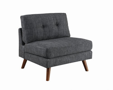 Update your living space with an armless chair from the churchill collection. mid-century modern details abound in this modular armless chair, with clean lines and button-tufted back cushions. the sleek style continues with tapered solid eucalyptus wood legs in a walnut finish, set at an angle for that throwback design element. popular charcoal grey upholstery lends a handsome neutral base to complement most any color palette. this armless chair can stand alone as a single seat, or be paired with other modular pieces from the collection to create the perfect seating for your space.