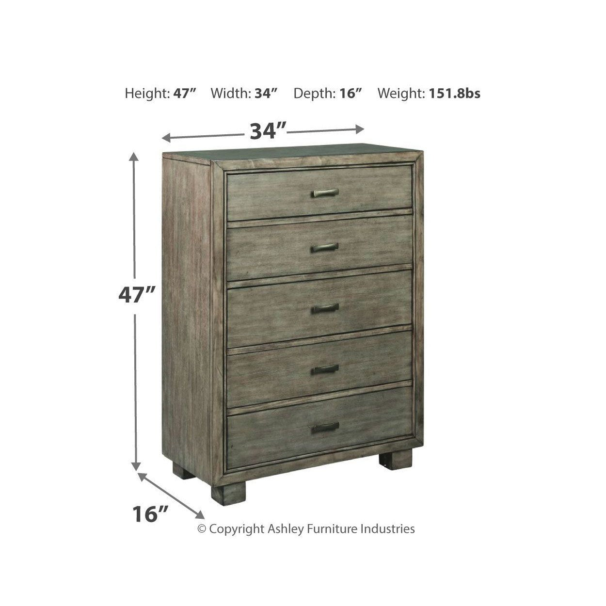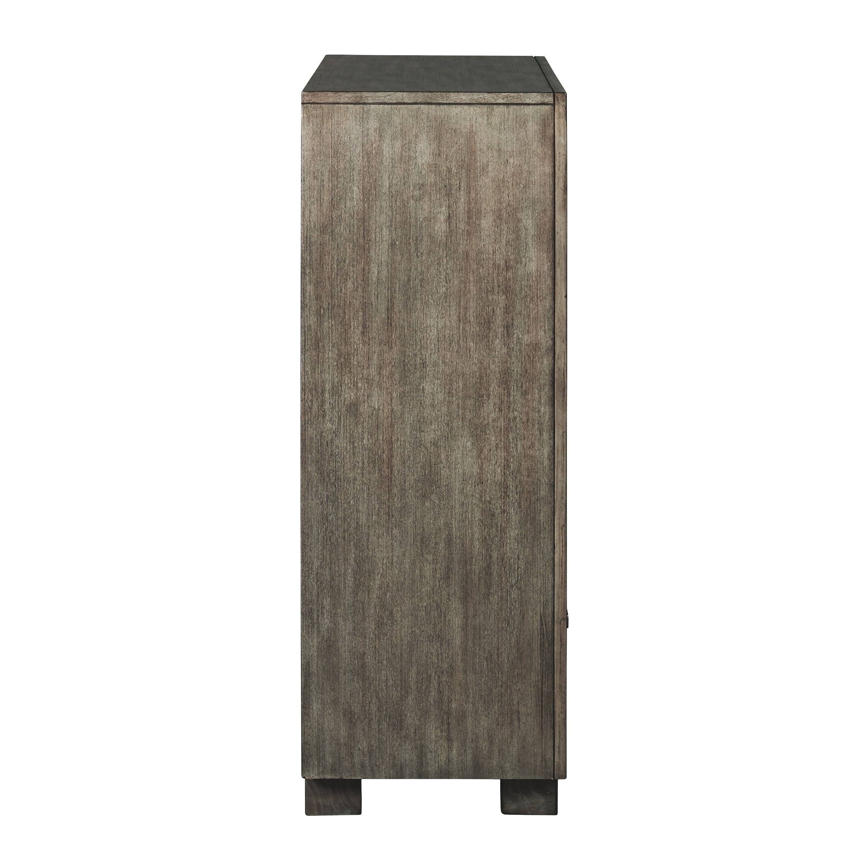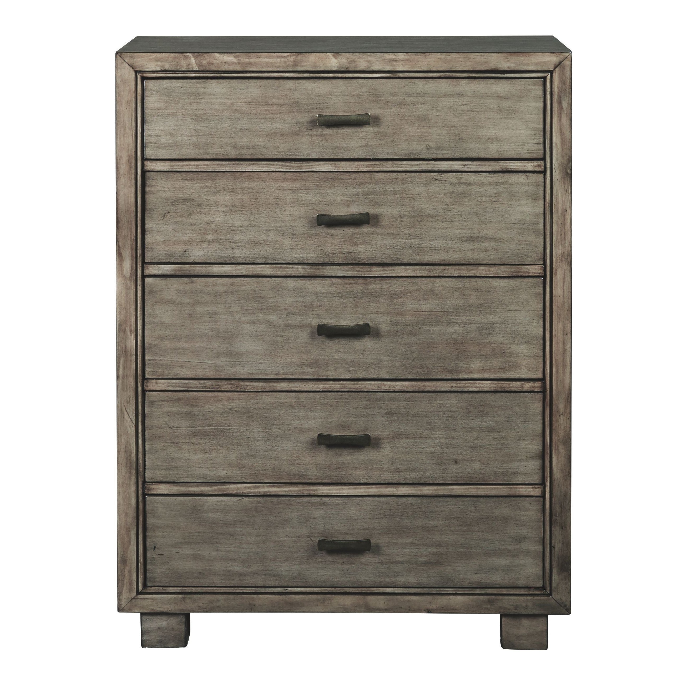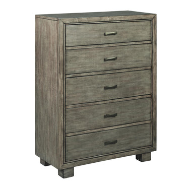 Melding modern and mid-century influences, this chest of drawers brings a fashion-forward perspective to bedroom furniture. The chest's ultra clean lines-which include flush-mount drawers and bold, blocky feet-are beautified with a smoky gray finish that's delightfully distinctive. Chunky bar pulls in a satin nickel-tone finish are a brilliant touch.