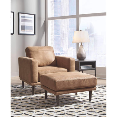 For a fresh spot in your space, turn to this designer chair and ottoman. Wind down at the end of a long day when you sink into this canyon of comfort.