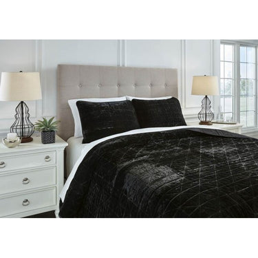 3-Piece quilt set - includes quilt and 2 shams. Velvet solid in black with stitched diamond design. Viscose/polyester blend face with cotton reverse and polyester filling. Machine washable.