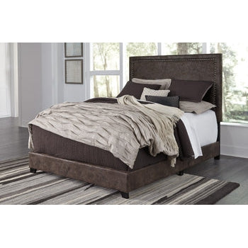 Covered in a fabulous faux leather fabric inspired by bomber jackets, this king upholstered bed is high style at a comfortably affordable price. String of goldtone nailhead trim adds a punch of character to bed's clean-lined profile. Mattress and foundation/box spring available, sold separately.