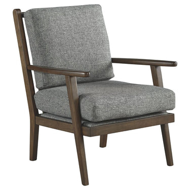 Feed your mid-century modern nostalgia with a contemporary twist in this accent chair. Colored in an attractive gray, it's upholstered in a timeless texture. Tapered legs and arms are a nice revival. Linear profile with two soft cushions adds plenty of fresh style, perfect for small spaces.