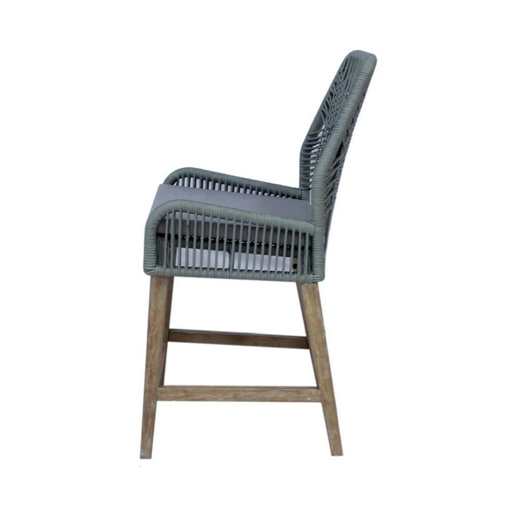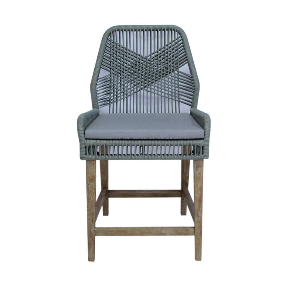 Modern lines convey a contemporary flair in this pair of counter height stools. breathable and stylish, each counter height stool features a main seat frame wrapped in a woven rope design. lending a rustic farmhouse flair are weathered asian hardwood legs, square and slightly tapered toward the foot. the rope-like design also lends a nautical-inspired vibe, perfect for coastal beachside cottages. in addition, each stool features supportive foot braces and a padded seat cushion.