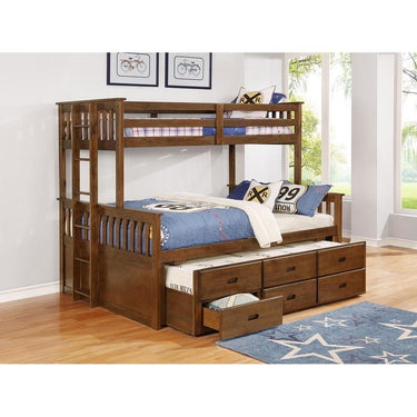 Perfect for those times when you have a full house, this bunk bed offers a variety of comfy sleeping arrangements for your guests. a twin bed up top is ideal for a little one, while a queen bed below allows adults to stretch out comfortably. a built-in trundle is hidden underneath for even more cozy sleep space. two large storage drawers round out the convenient appeal of this versatile bed. complete with a beautiful, weathered walnut finish over a sturdy wooden frame, this bed is as fashionable as it is functional.