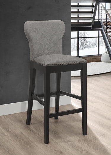 Slide this contemporary stool up to your dining space for a classical touch. perfect for transitional dining areas and homes, this stool offers total comfort and stability with footrests and an upholstered seat. with a wingback style design, the seat is wrapped in a soft gray fabric lined with a bronze nailhead trim that offers a traditional touch and elegant detail. resting on long tapered legs in a bold black finish, this stool offers a neutral, contrasting color palette that also lends itself nicely to modern farmhouse homes. place it in a rustic lodge or lakeside retreat for a chic, sophisticated flair.