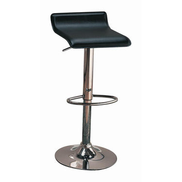 An adjustable barstool with a modern silhouette is a beautiful upgrade to any kitchen or lounge space. featuring black upholstery, the stool features a curved seat that offers just the barest hint of a back. the seat is height adjustable to accommodate a range of table and counter heights. a chrome finish lends gleaming appeal to a pedestal base. a built-in footrest provides a final touch of comfort and support.